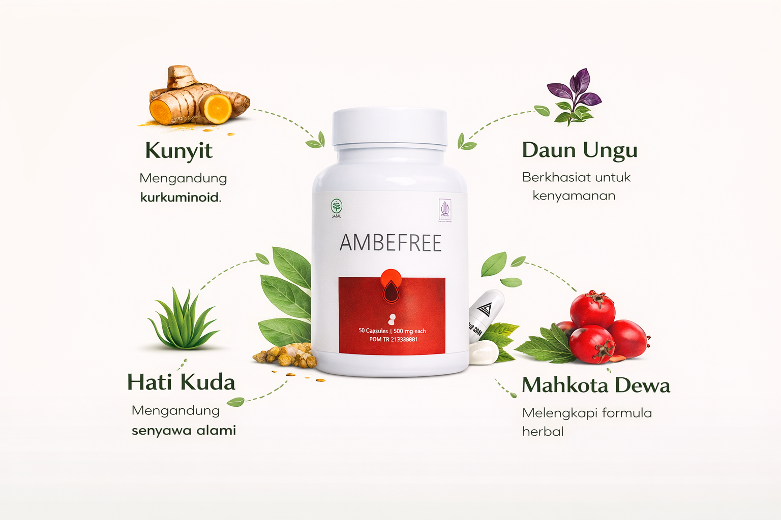 Ambefree adalah obat ambeien alami berbahan herbal tradisional yang diformulasikan khusus untuk membantu meredakan gejala ambeien seperti nyeri, bengkak, gatal, hingga BAB berdarah. Dirancang dari herbal pilihan yang bekerja membantu mengurangi peradangan dan memberikan rasa nyaman pada area anus.